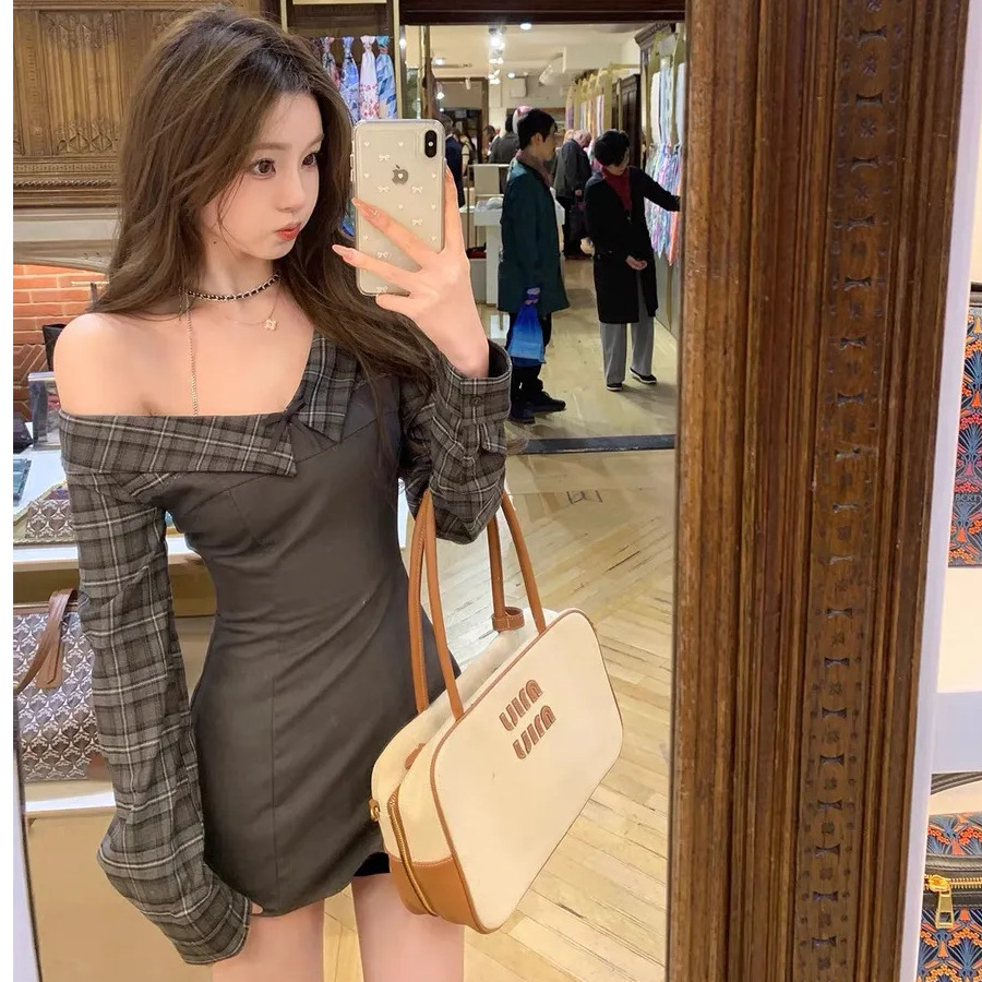 秋冬法式复古格纹拼接假两件露肩包臀短裙纯欲辣妹显瘦百搭长袖潮