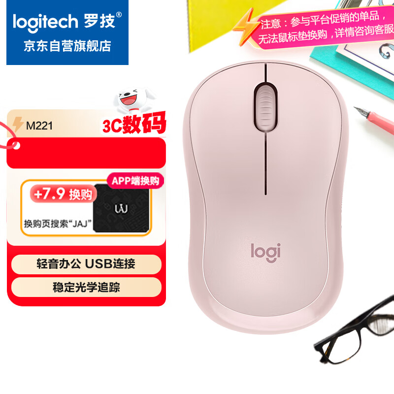 罗技(Logitech)M221轻音鼠标 无线鼠标 办公鼠标 对称鼠标 带无线微型接收器 茱萸粉